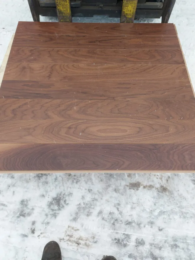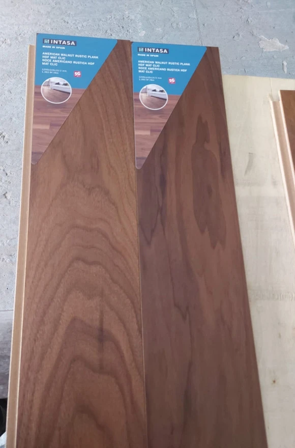 INTASA GALPARQUET, паркетная доска Орех американский. Покрытие: cупер матовый лак-7 слоев. Тип соединения: Click Нижний слой из цельного листа хвои 2 мм.Средний слой HDF влагостойкий 9 мм., Верхний слой Шпон массива ореха американского 2 мм. Сортировка: рустик, полноразмерные доски, Испания