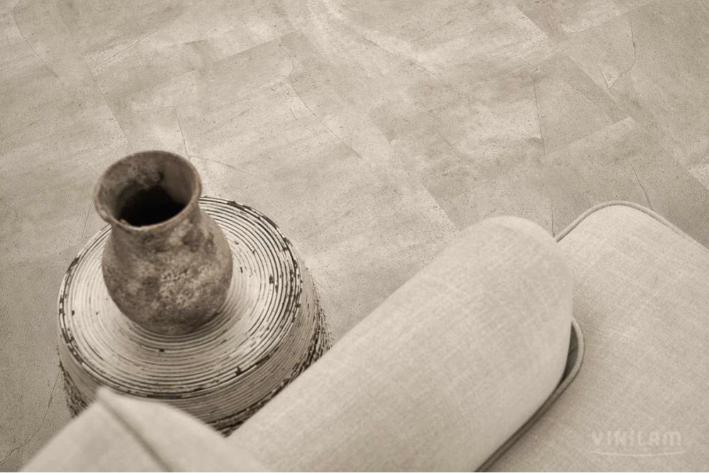 Коллекция Ceramo Stone — виниловый пол на основе твёрдой плиты SPC: первичный винил с минеральным наполнителем, плотность плиты 2000 кг/м³. Композит SPC водостойкий, термостабильный — является заменой керамической плитке с укладкой плавающим способом. Защитный слой 0,5 мм из прозрачного ПВХ + 2 слоя полиуретана с керамической крошкой и антибактериальными добавками обеспечивает 43 класс эксплуатации. Материал подходит для тёплого пола, не скользкий (класс R10), износостойкий (класс T), светостойкий (>6), стойкий к химикатам и колёсикам кресел, противопожарный (класс КМ2). По периметру плитки V-образная микро фаска, тиснение в регистр с эффектом брашированной поверхности полностью повторяет фотографический декоративный слой. В Ceramo Stone для улучшения шумопоглощающих свойств снизу плиты приклеена подложка IXPE толщиной 1 мм.