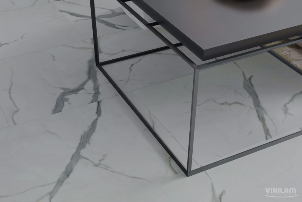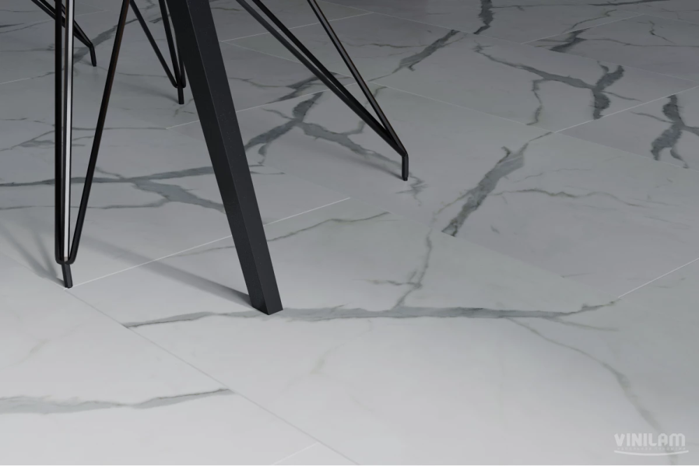 Коллекция Ceramo Stone Glue — клеевой виниловый пол на основе LVT первичный винил - водостойкий, термостабильный — является заменой керамической плитке с укладкой плавающим способом. Защитный слой 0,5 мм из прозрачного ПВХ + 2 слоя полиуретана с керамической крошкой и антибактериальными добавками обеспечивает 43 класс эксплуатации. Материал подходит для тёплого пола, не скользкий (класс R10), износостойкий (класс T), светостойкий (>6), стойкий к химикатам и колёсикам кресел, противопожарный (класс КМ2). Тиснение в регистр с эффектом брашированной поверхности полностью повторяет фотографический декоративный слой. Нет выраженной фаски.